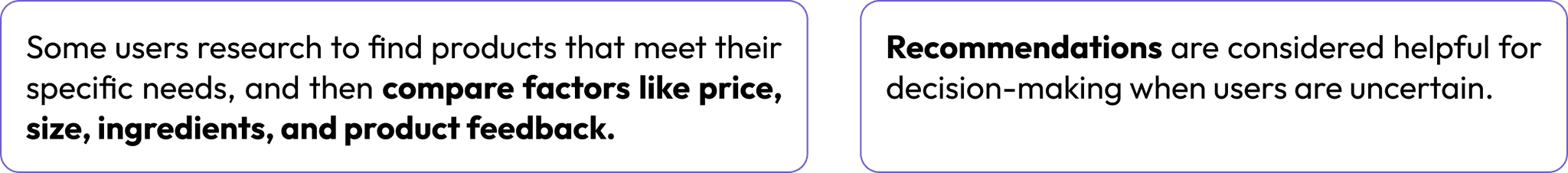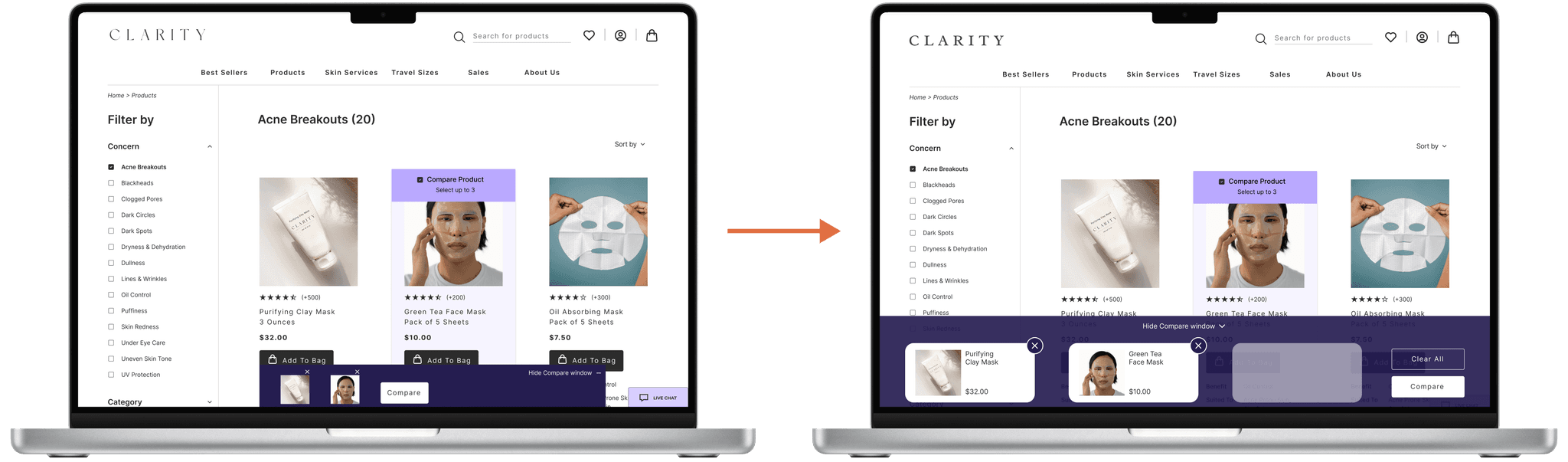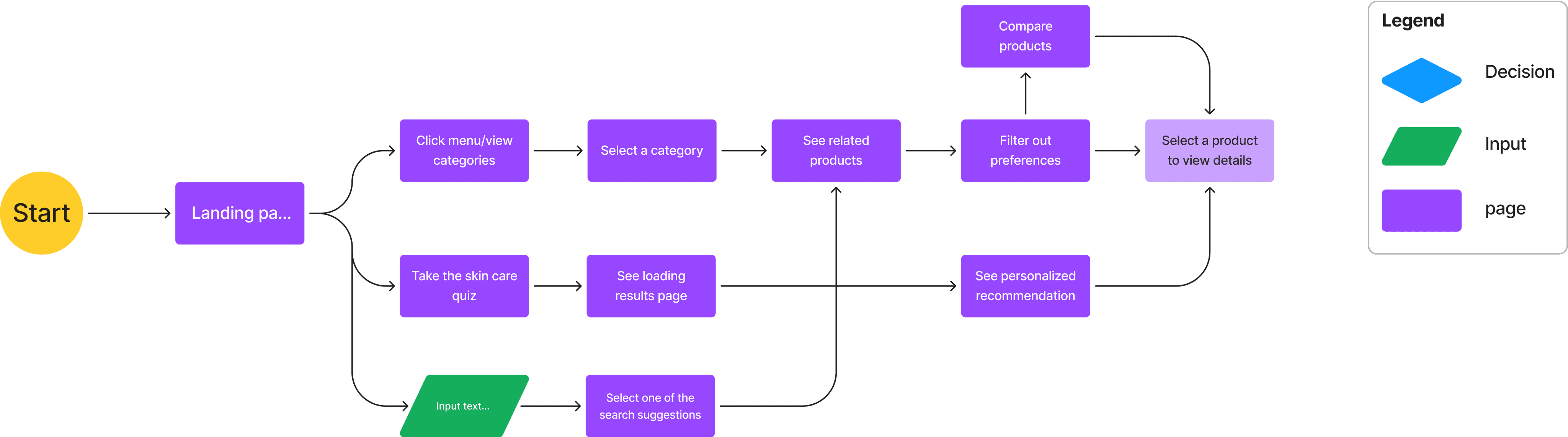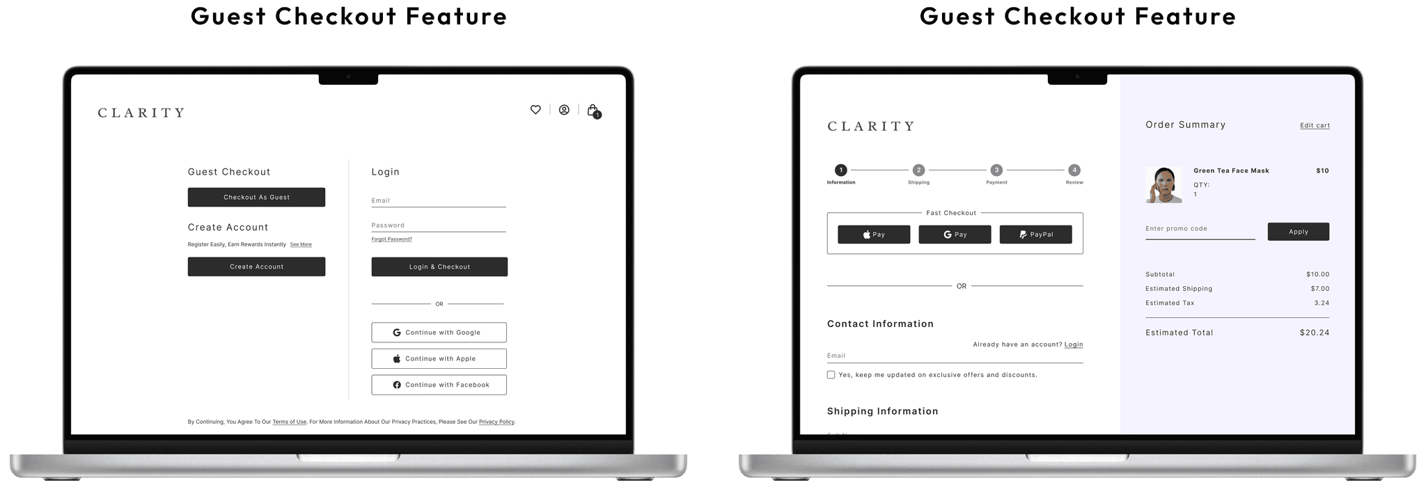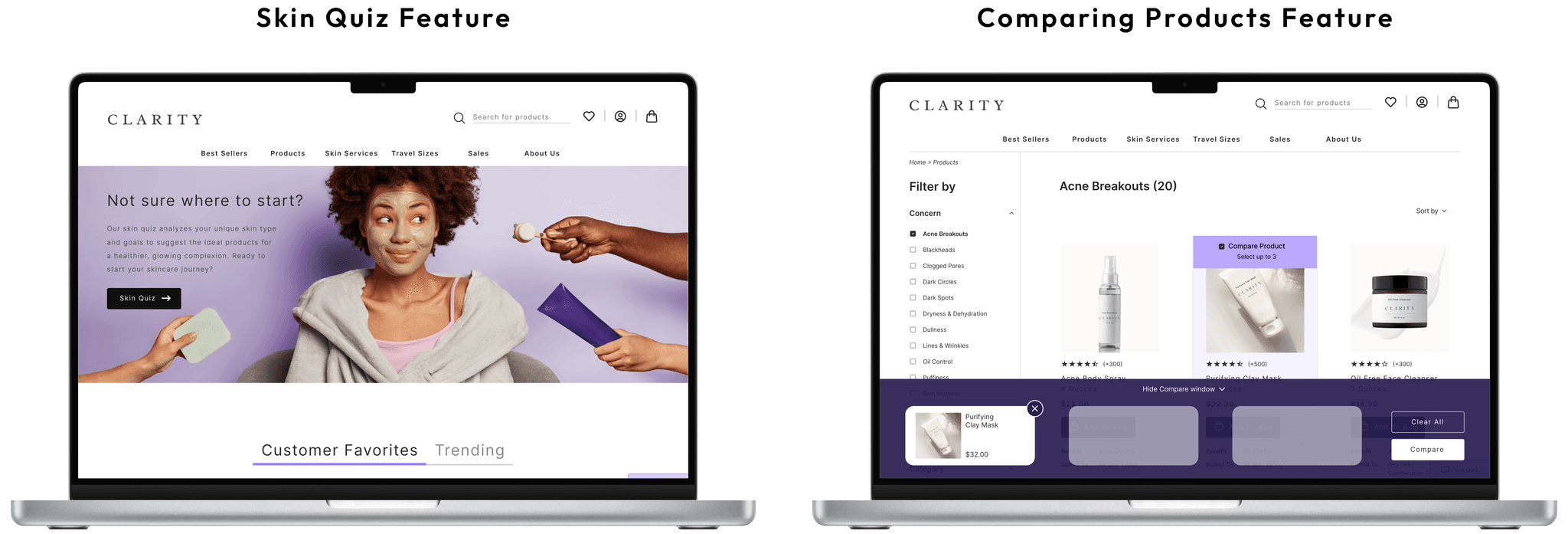 Addressed key issues like cart abandonment and analysis paralysis by introducing a personalized skin quiz, product comparison tool, guest checkout, and a fast, secure, transparent checkout process, resulting in a 20% success rate in usability tests.