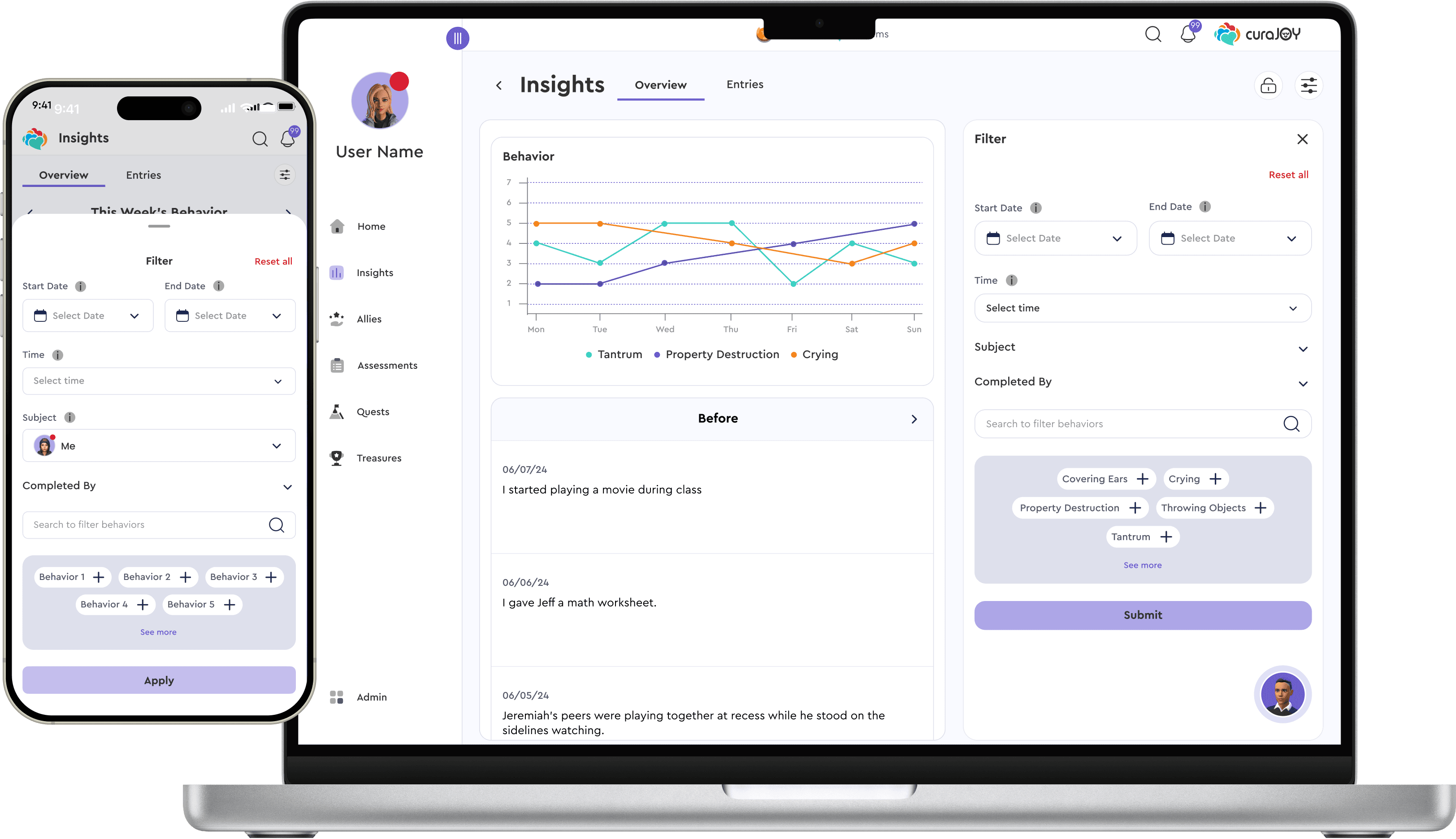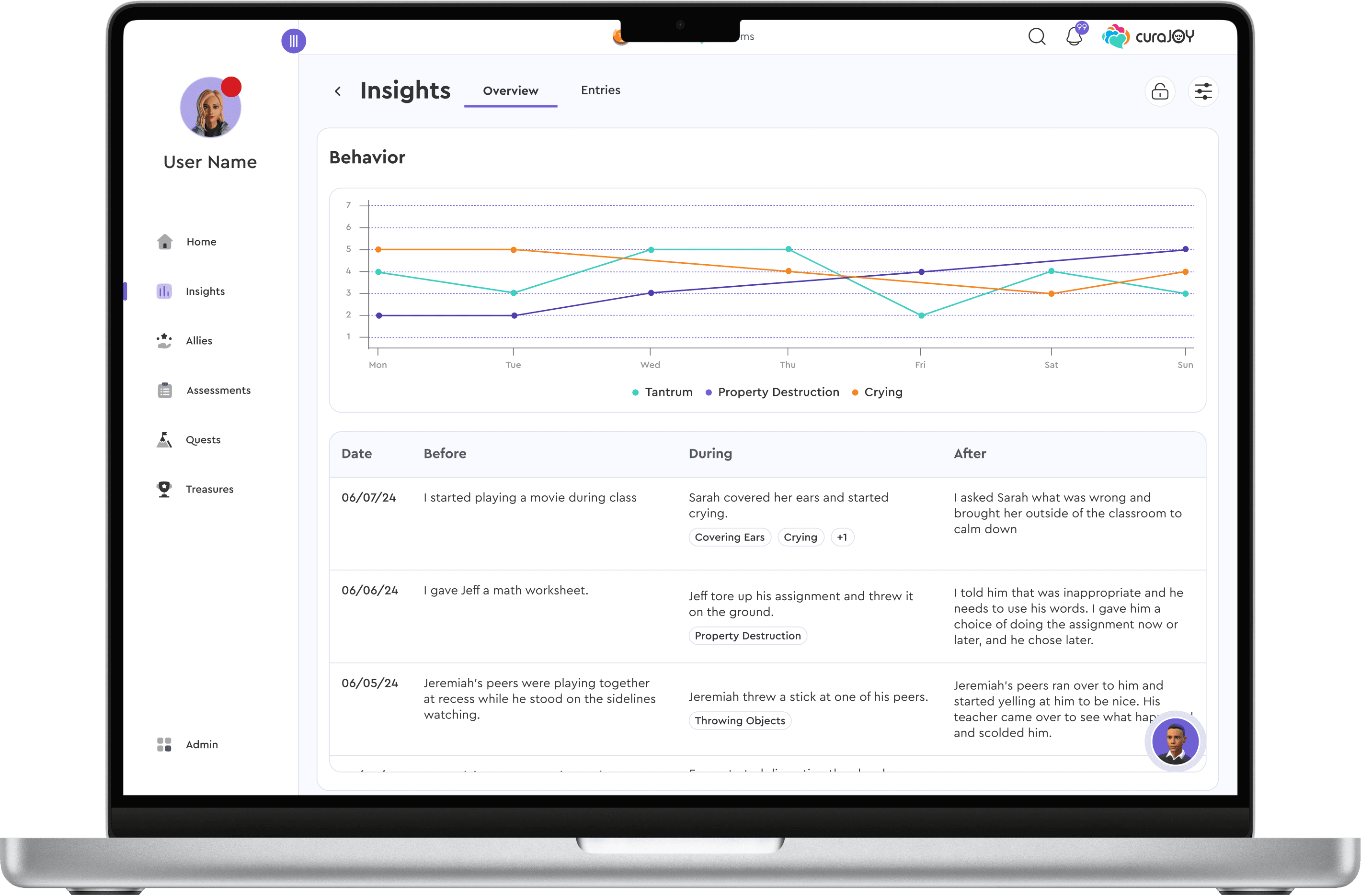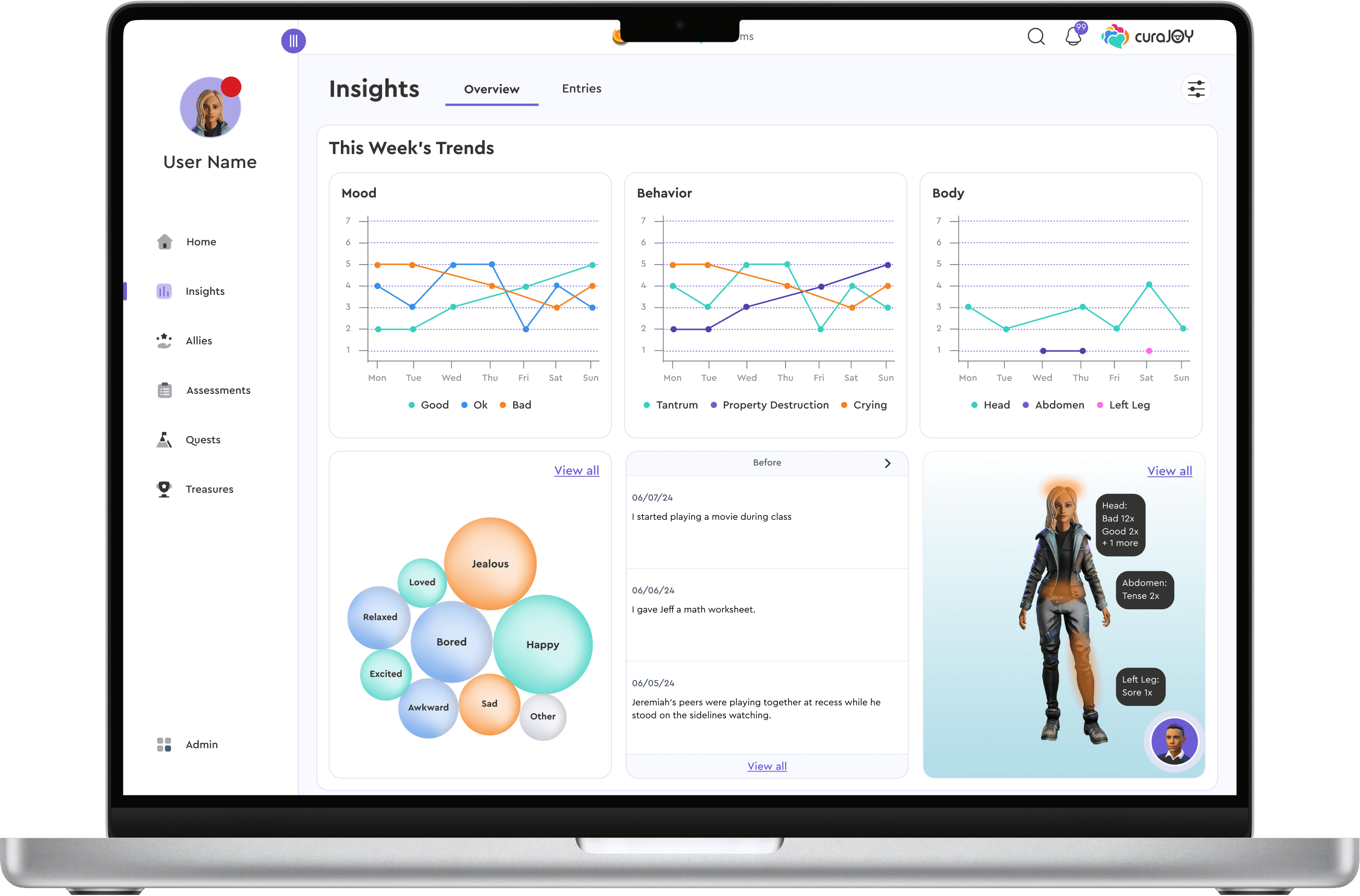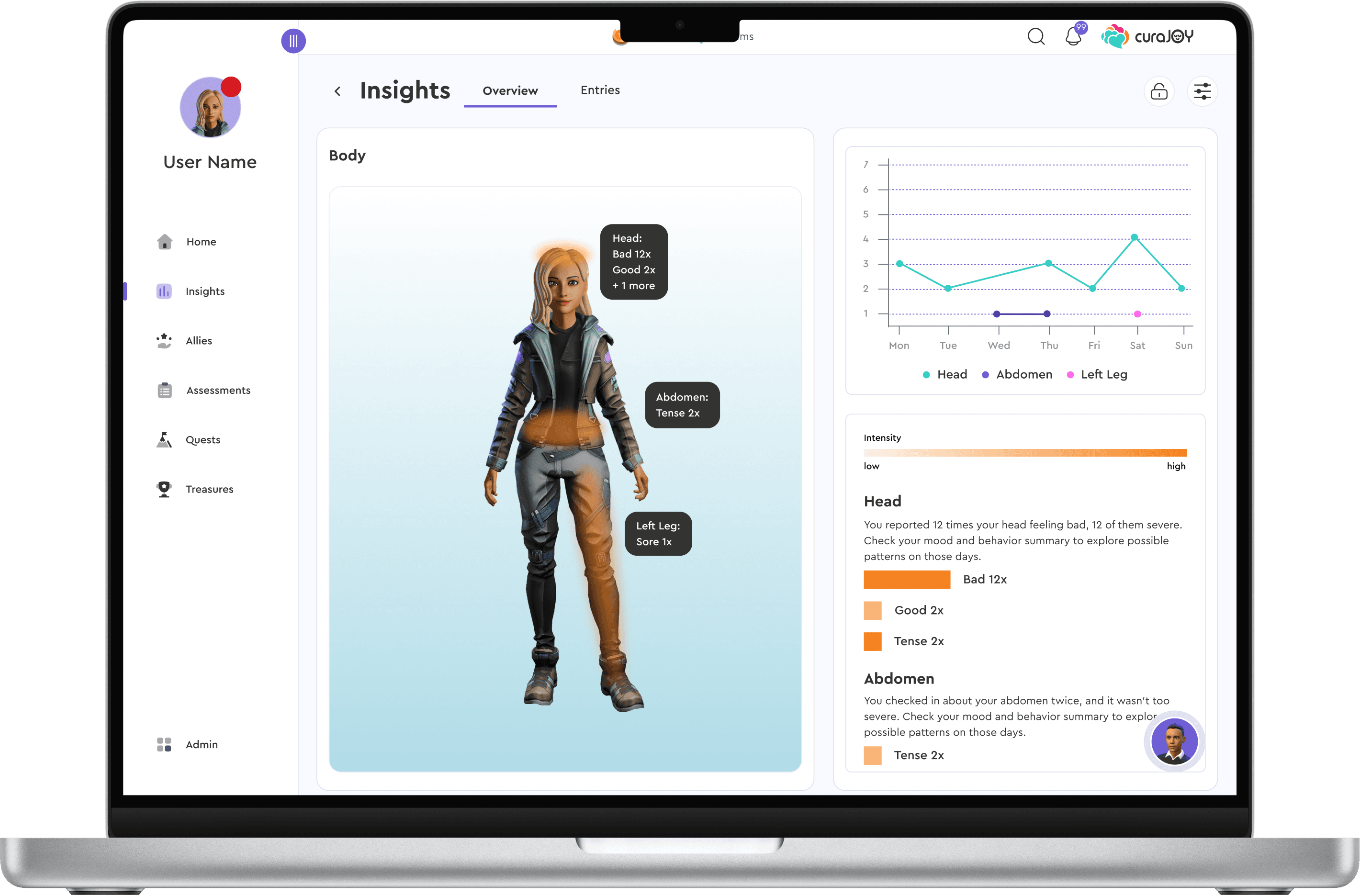 CuraJOY is a nonprofit that uses gamification and AI to make mental health support more accessible. The Insights Page is a new feature that brings together user-submitted data (mood, body, and behavior check-ins) into one centralized view.