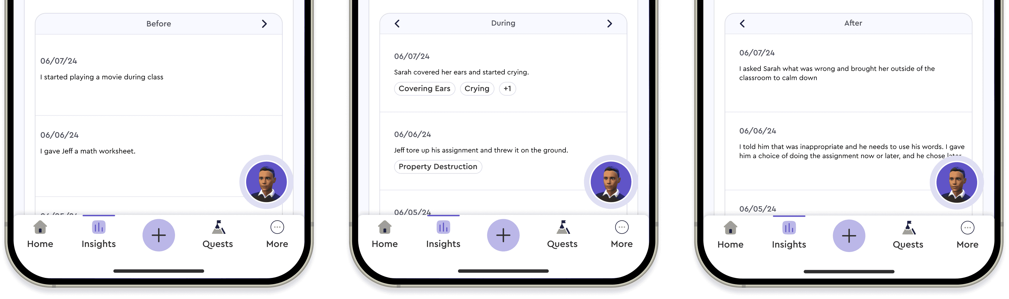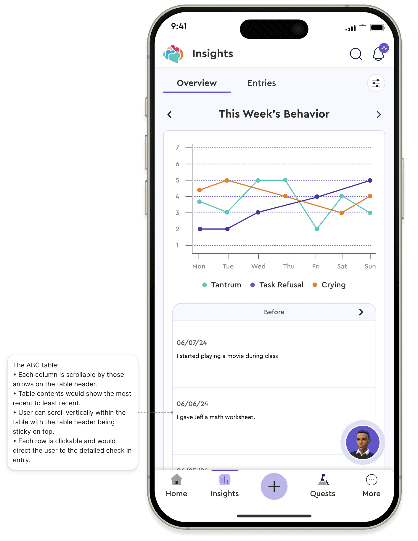 Mobile space constraints made it hard to show all ABC behavior columns (Before, During, After) in one table. We solved this by displaying each column in its own view, with chevrons to navigate between them.