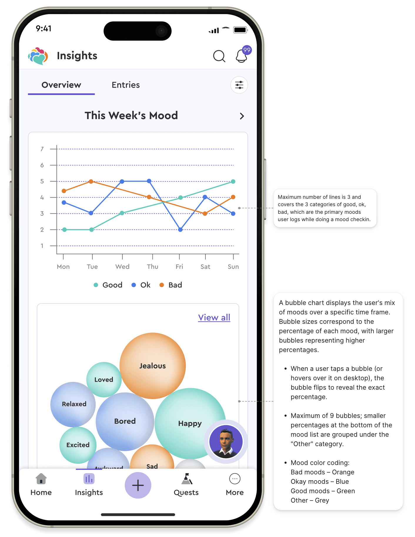 Early low-fidelity design (calendar for mood data visualization changed to bubble charts in future iterations)