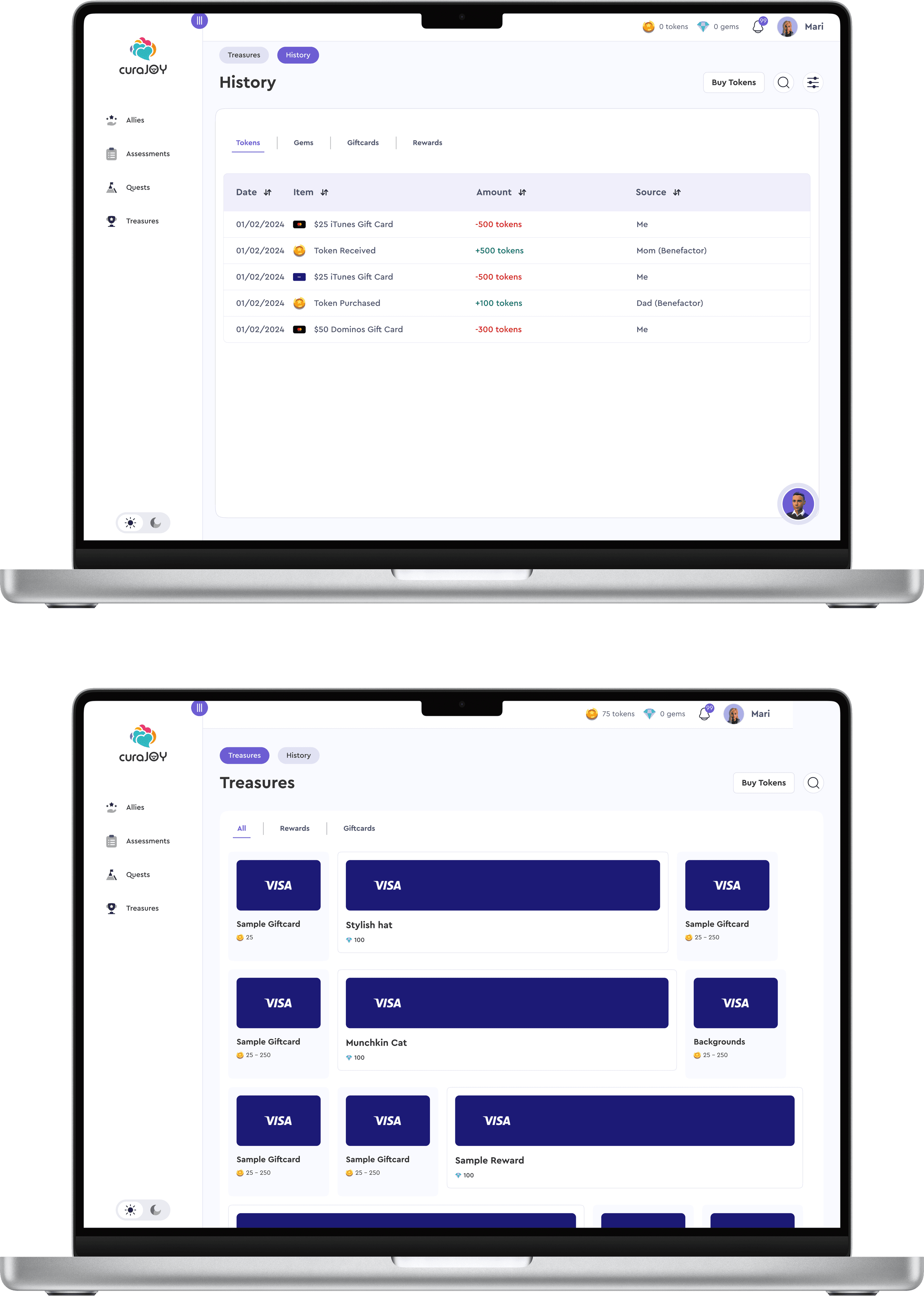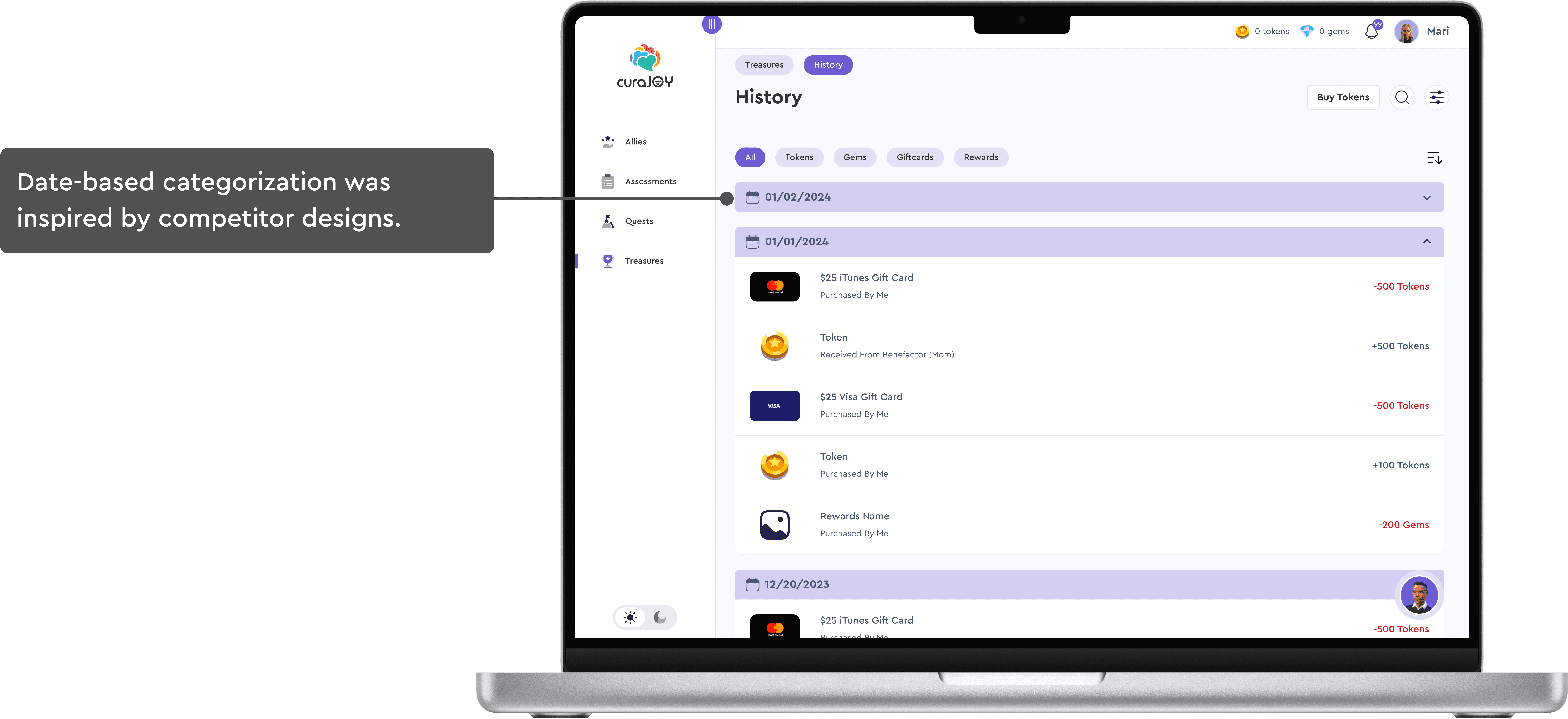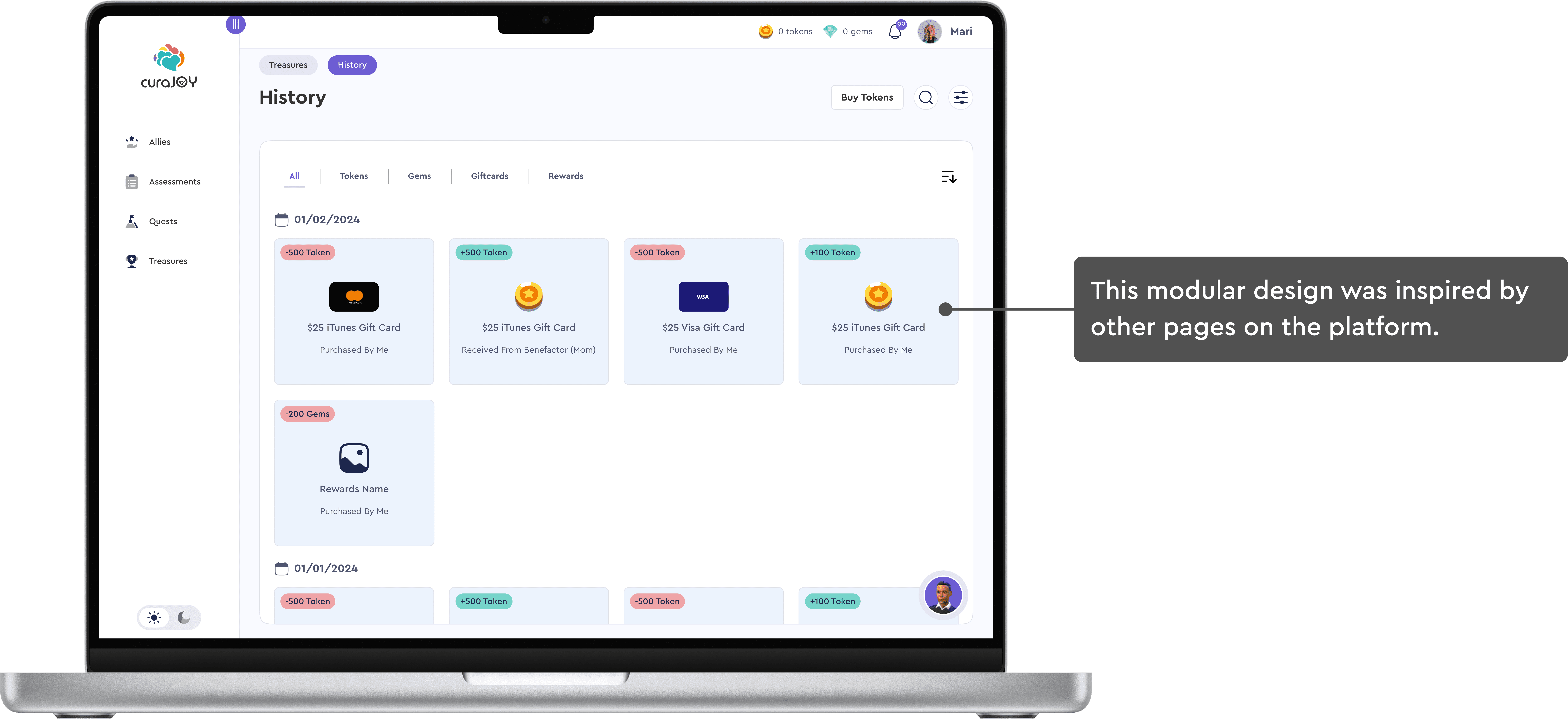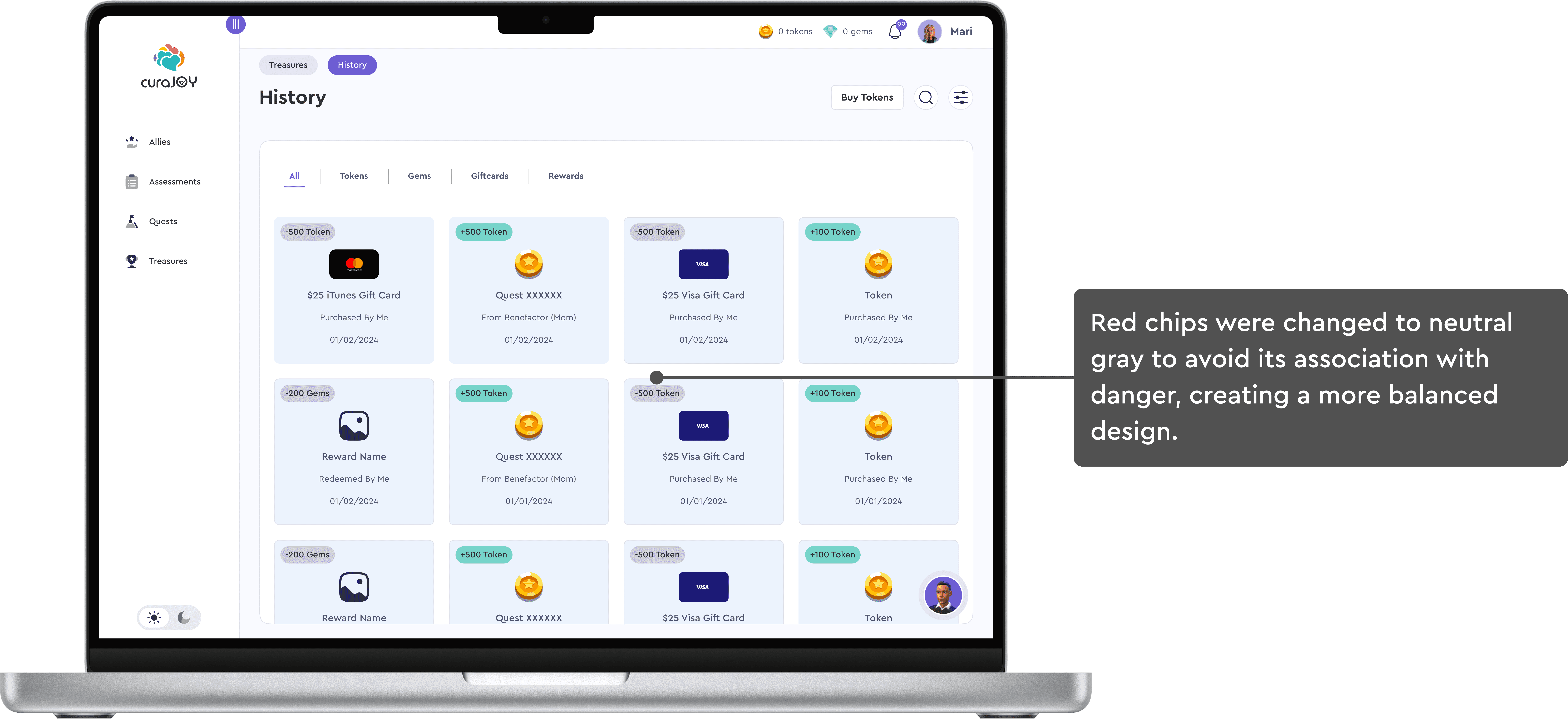 The rewards inventory and the rewards history pages lack visual appeal. The display of rewards history should be different; it should be visually pleasing and gratifying for the user to see all the treasures they’ve collected.