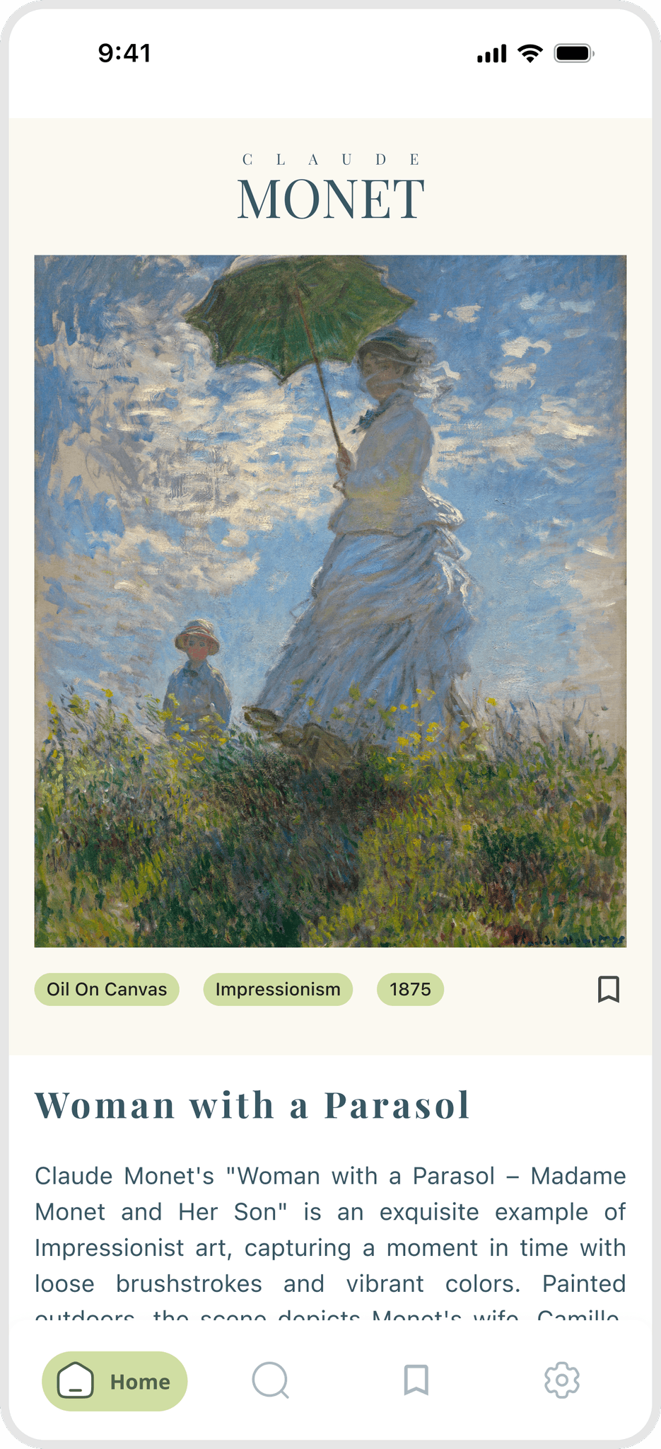 I imagined a mobile app called “Daily Art” that introduces one painting each day, along with its story, artist background, and fun facts.