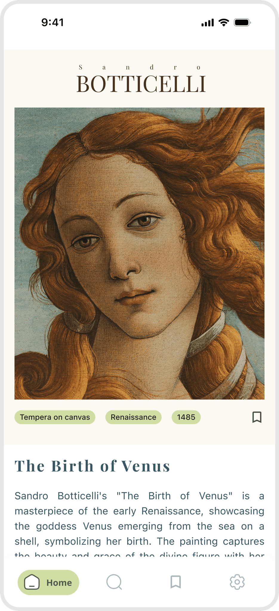 The sign-up screen was my first opportunity to set the tone, artistic yet minimal, inviting users into a calm, creative space where learning about art feels effortless.
